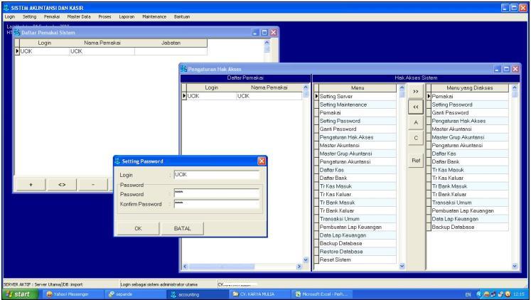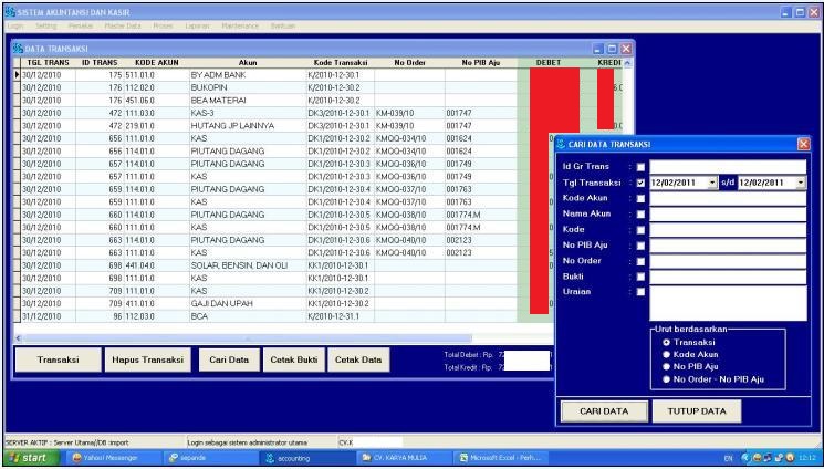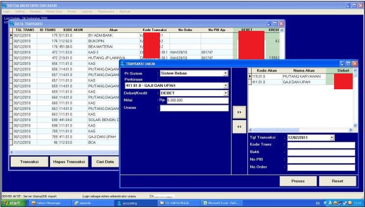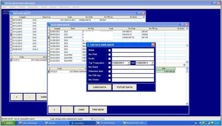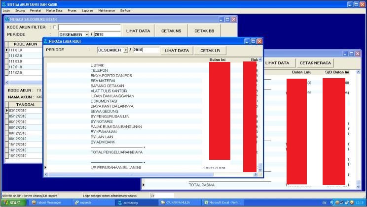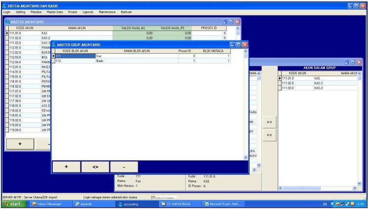 Merupakan project accounting export/import yang dipakai di CV. AA, CV. GMS, dan PT. MMT. Sistem ini memasukkan data akuntansi yang dilengkapi dengan kecerdasan untuk melihat kesalahan-kesalahan dalam jurnal akuntansi, mengecek keseimbangan saldo, serta otomatis membentuk laporan neraca saldo bulanan, laporan laba rugi, dan neraca.