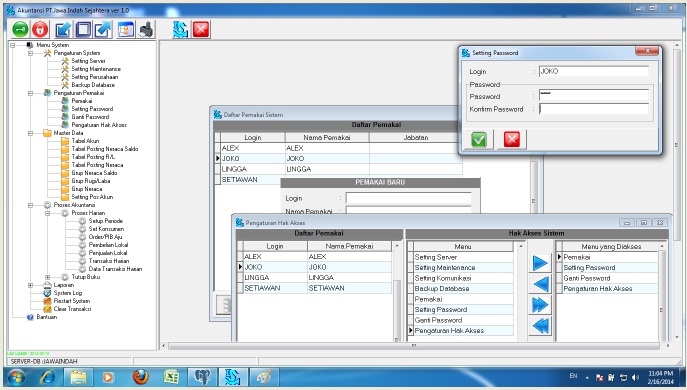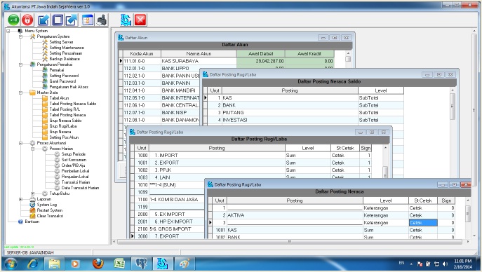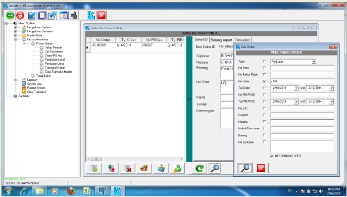 Merupakan project custom akuntansi untuk PT.JIS yaitu sistem akuntansi dan finance yang terintegrasi dan terhubung langsung dengan program PIB Bea Cukai. System ini terdiri dari penjurnalan akuntansi, pembuatan laporan akuntansi (Neraca, Neraca Saldo, Buku Besar), Proses bisnis import yaitu dari order sampai dengan penjualan barang, Proses bisnis perdagangan lokal, dan pembuatan dokumen-dokumen penunjang seperti Purchasing Order, Nota Penjualan, Faktur Pajak, dll.